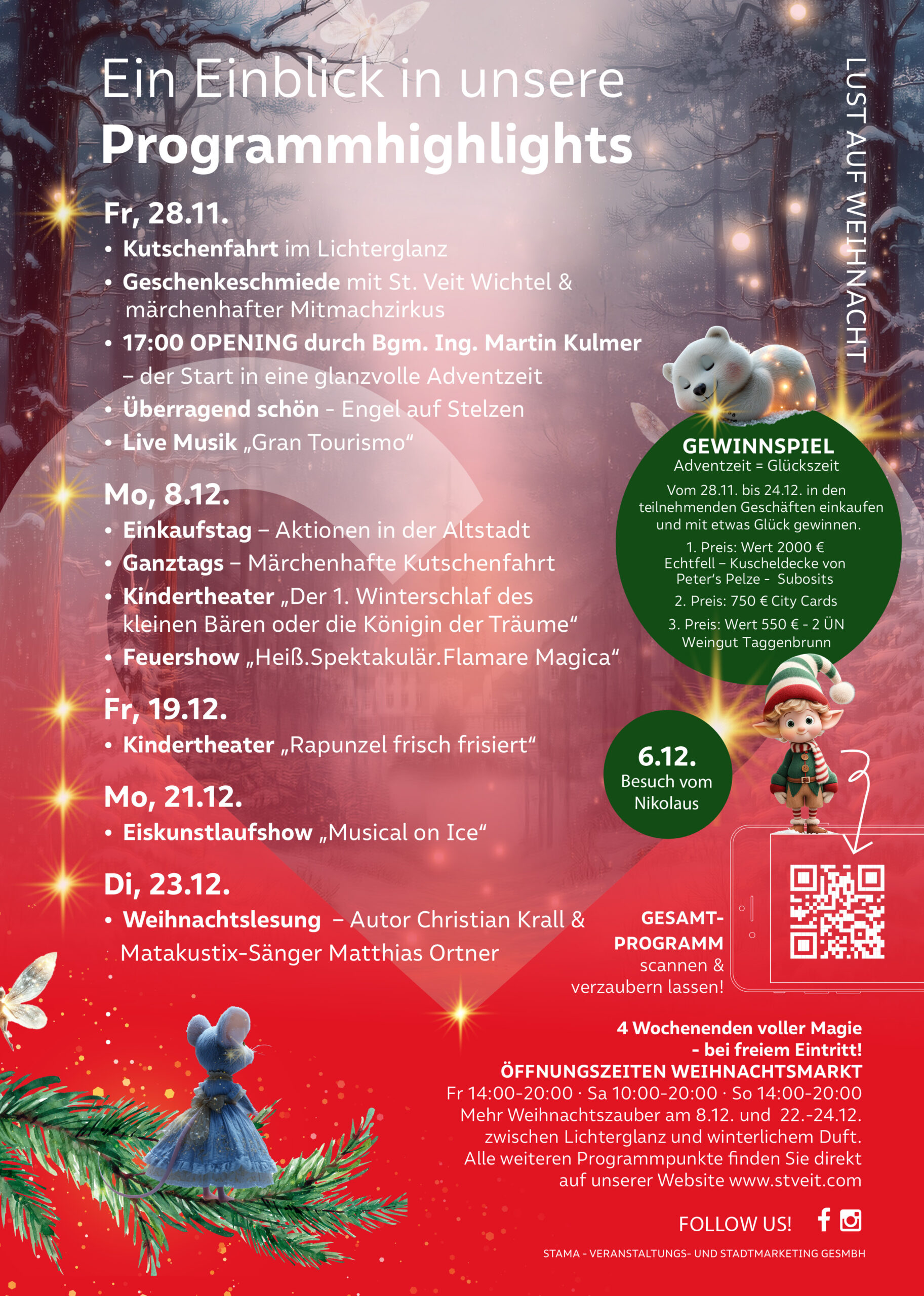 Der Weihnachtsmarkt in der Altstadt von St. Veit wird dabei zur Bühne voller Magie – umhüllt von Glühweinduft, Maroni und Weihrauch, während Karussell und Weihnachtszug ihre Runden drehen. Kinder basteln in der Geschenkeschmiede, jonglieren im Mitmachzirkus und begegnen märchenhaften Walking Acts wie dem Hutmacher am Hochrad. Märchenhafte Theatervorführungen, Live-Musik und Chöre uvm. machen den Advent für die ganze Familie einfach unvergesslich.